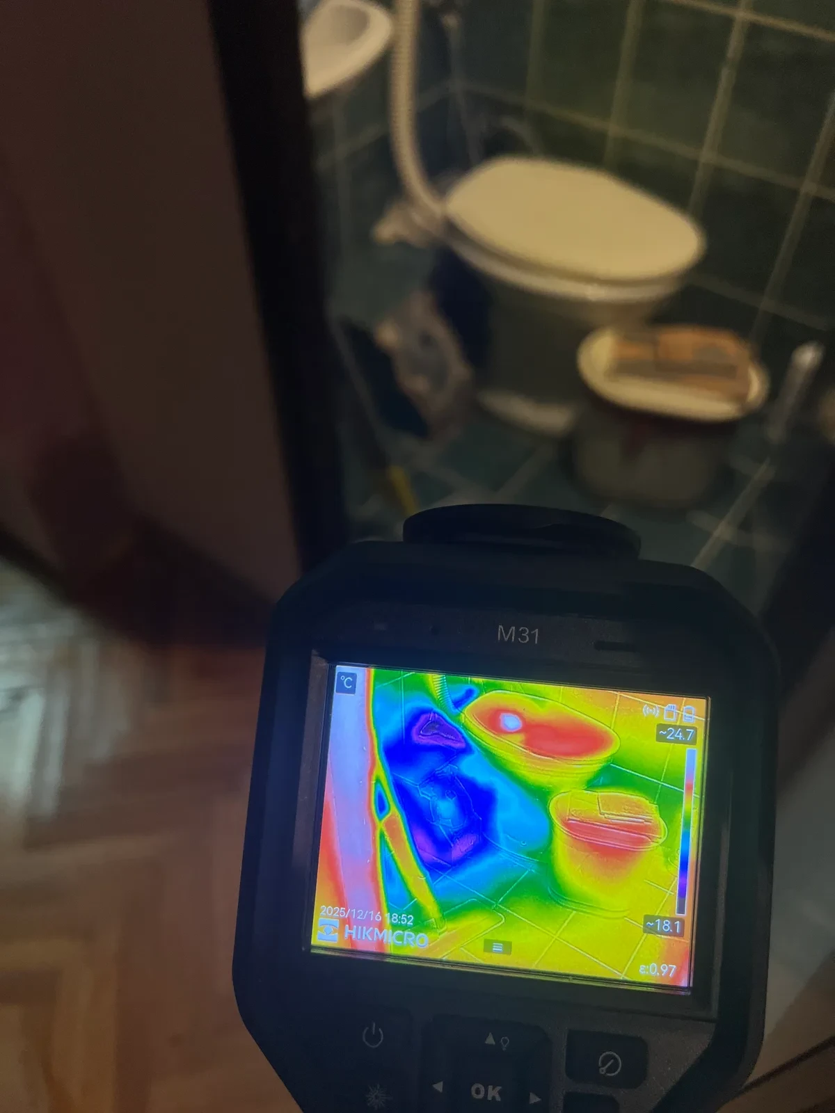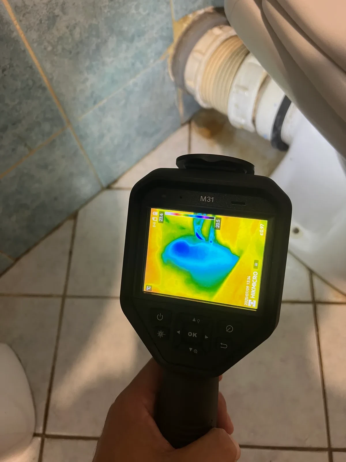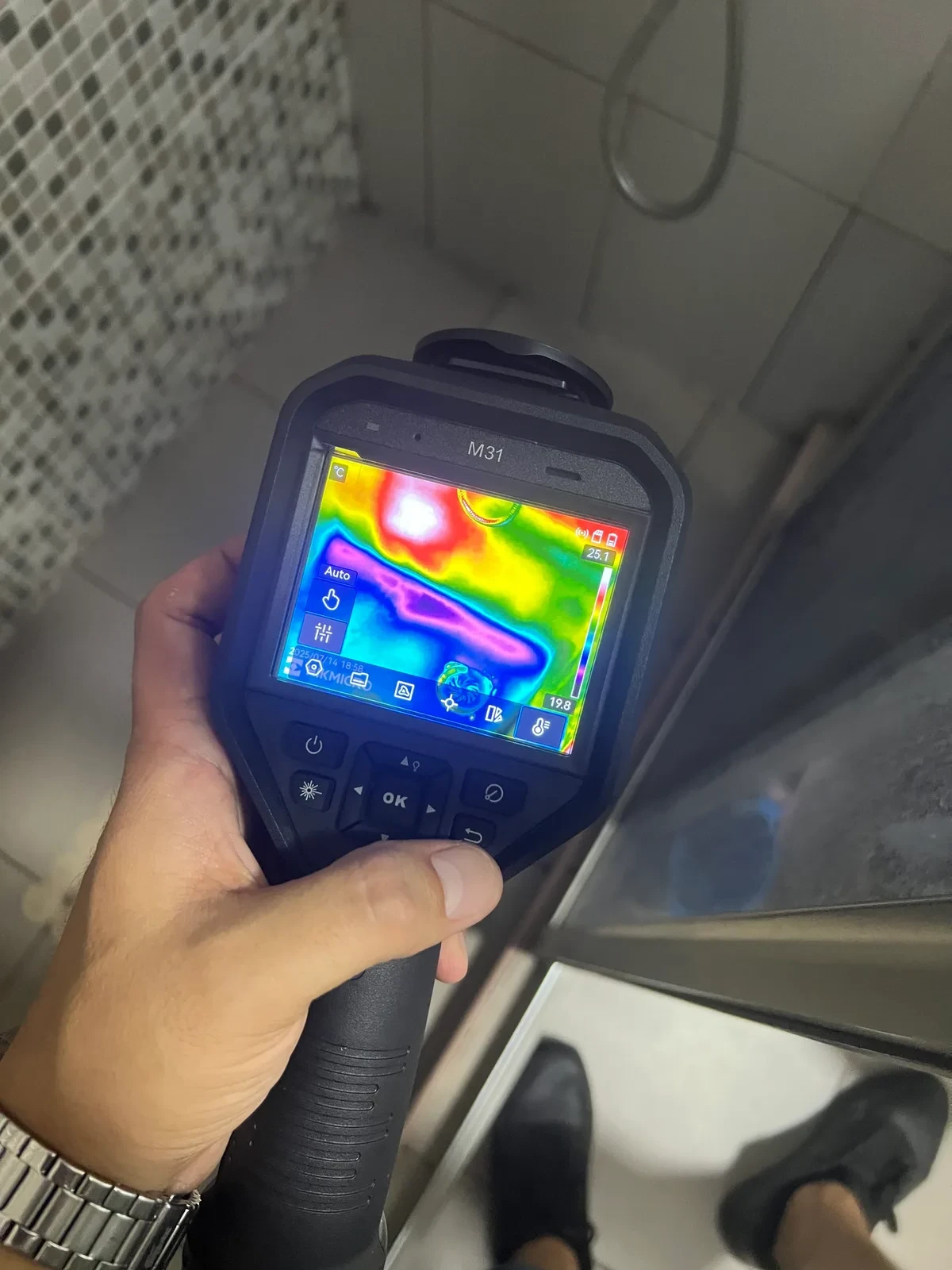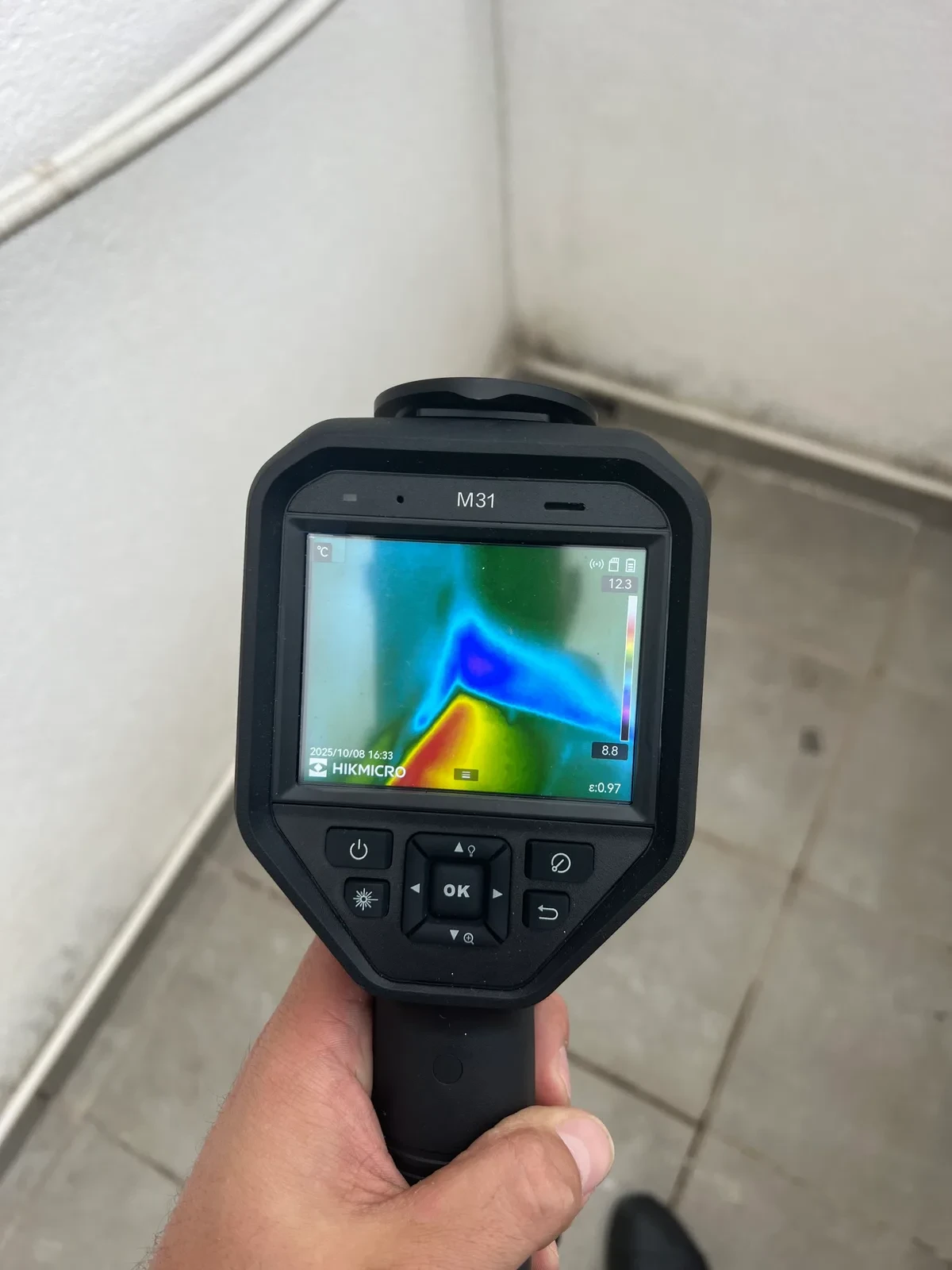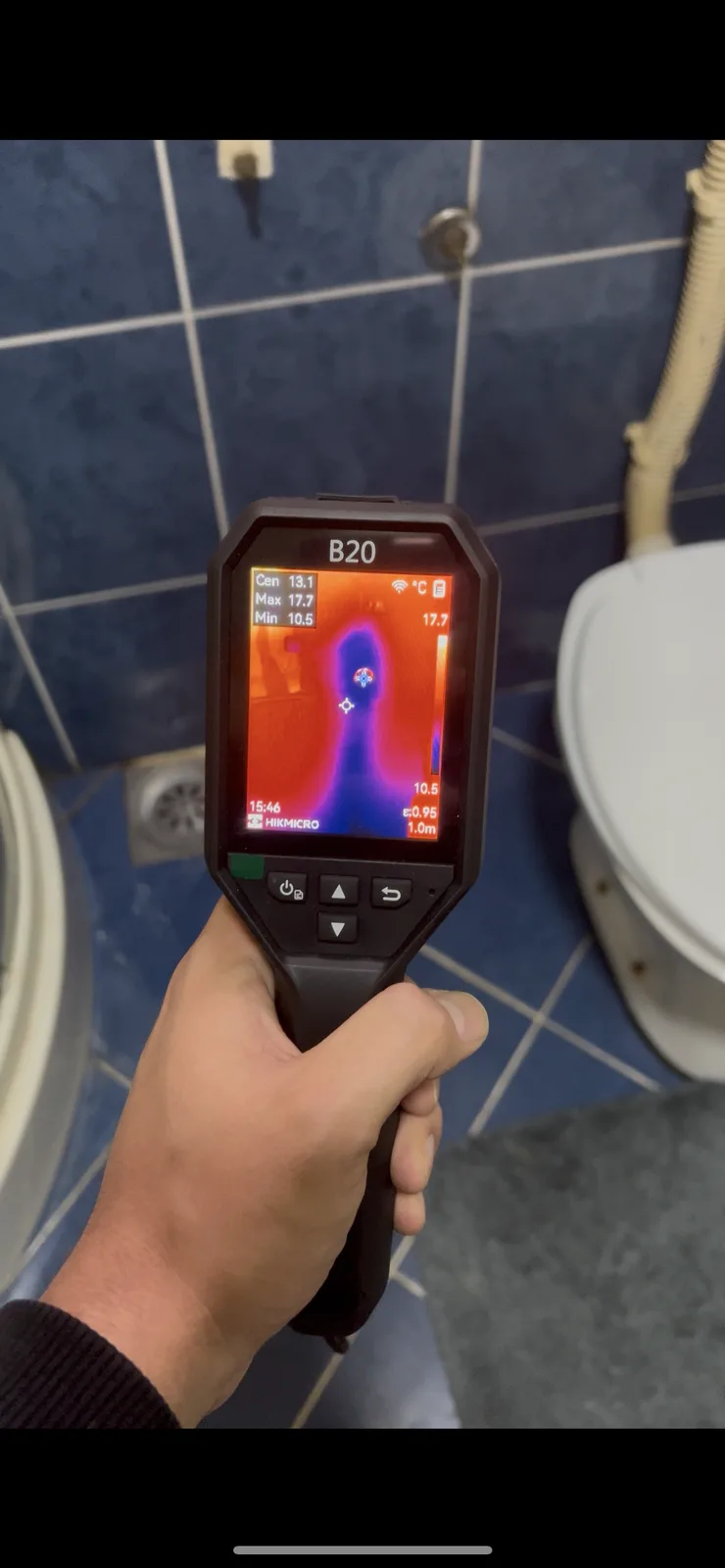 Termovizijskom kamerom pratimo temperaturnu razliku između mokrog i suvog materijala, jasno vidljivo čak i kroz debele zidove. Posebnu pažnju posvećujemo detektovanju puknutih cevi koje se skrivaju iza pločica, gipsa ili betona.